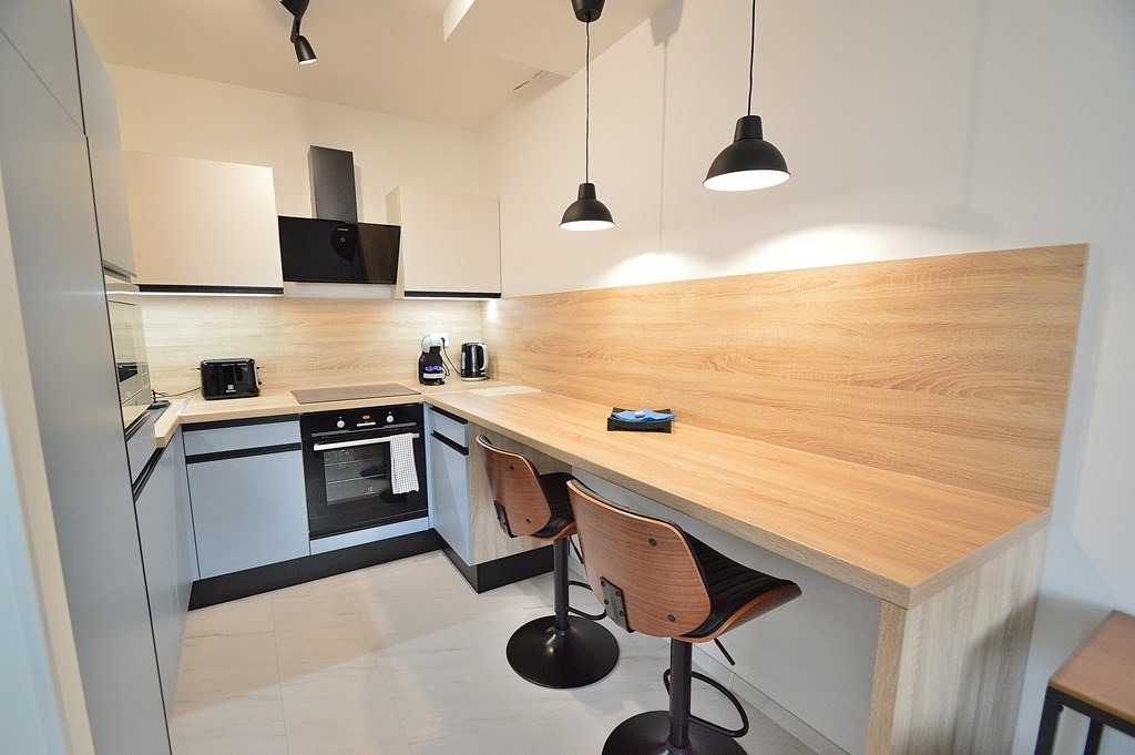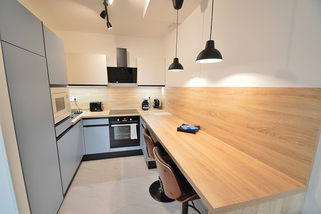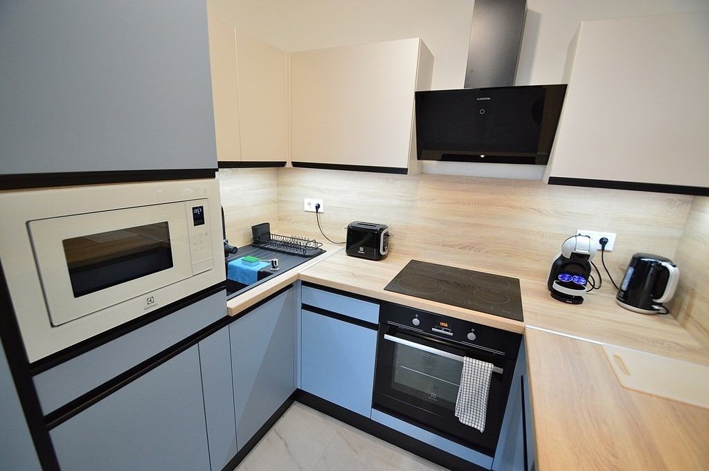 - gépesített konyha (hűtő, mosogatógép, sütő, főzőlap, páraelszívó, mikrohullámú sütő, kávéfőző, vízforraló, kenyérpirító, mindenféle edény, poharak, tányérok, evőeszközök stb.)